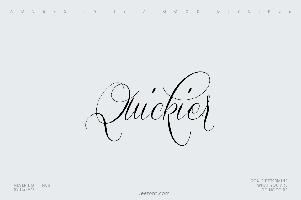 Quickier is an elegant script font designed by renowned type designer Måns Grebäck. This refined calligraphy typeface combines flowing curves with precise letterforms, perfect for creating sophisticated typography. Originally released in 2012, Quickier has become a popular choice for tattoo designs, logos, and creative headlines. The font features smooth, hand-crafted strokes that convey elegance and artistry, making it ideal for brands seeking a distinctive, polished aesthetic. With its versatile character set and professional appeal, Quickier delivers beautiful, eye-catching results for design projects that demand sophistication and creative expression.