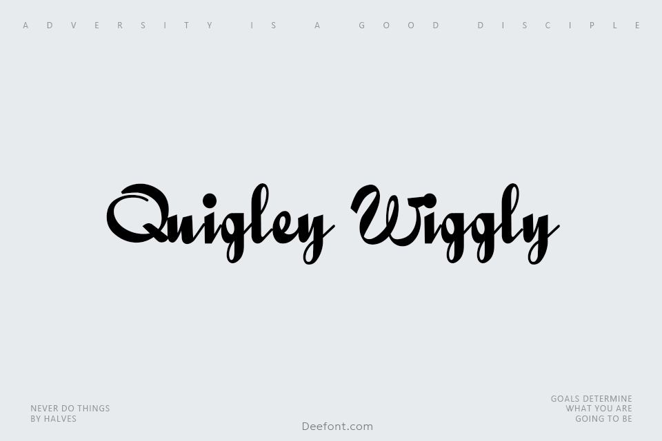 Quigley Wiggly is a playful and distinctive script font designed by Nick’s Fonts that brings whimsical character to your creative projects. Originally inspired by lettering found on a toothpick wrapper, this casual handwriting typeface features charming, slightly quirky letterforms perfect for display purposes. With 399 glyphs and distinctive personality, the font excels at adding personality and retro charm to designs ranging from invitations to posters. Its versatile nature makes it ideal for projects requiring a friendly, informal aesthetic.