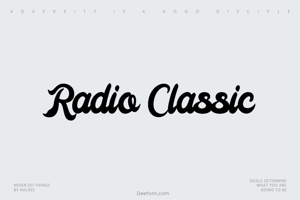 Radio Classic is a bold, flowing script font designed with a playful and dynamic appearance. The connected characters create a smooth, elegant style perfect for branding projects, product packaging, and decorative text overlays. This font combines classic retro aesthetics with contemporary design sensibilities, making it ideal for eye-catching headlines, logos, and creative typography that demands attention and personality.