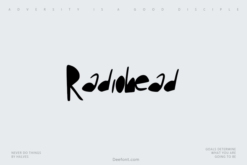 Radiohead is a playful and artistic script font designed by India M, featuring quirky hand-drawn characteristics with unique letterforms and informal styling. This versatile typeface perfectly captures creative expression, making it ideal for artistic projects, music-related designs, and casual branding applications. With its distinctive personality and flowing variations, Radiohead adds character and individuality to any design.