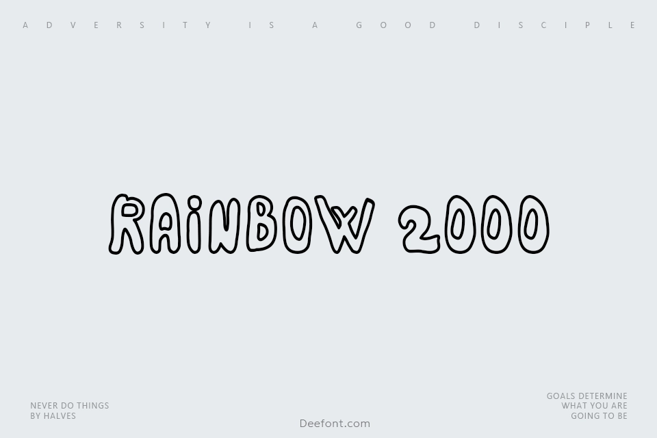 Rainbow 2000 is a vibrant outlined cartoon font designed by GGBotNet, blending retro and futuristic styles with playful shapes and bold lines. Released in 2022 with four font files (Regular, Italic, Bold, Bold Italic), this typeface features 192 glyphs and exudes warmth and creativity. The font’s smooth flowing arcs and rounded shapes create a sense of movement and energy, making it perfect for posters, logos, social media graphics, and web design projects that demand expressive and friendly typography.