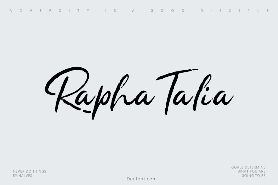Rapha Talia is a dynamic and expressive handwritten script font featuring fluid strokes and organic flow. This partial font embodies a bold and confident presence with unique flair in each character. The brush-like texture and varying stroke thickness contribute to its lively and energetic appearance, making it ideal for greeting cards, invitations, branding, and artistic projects requiring personal touch and authentic warmth.
