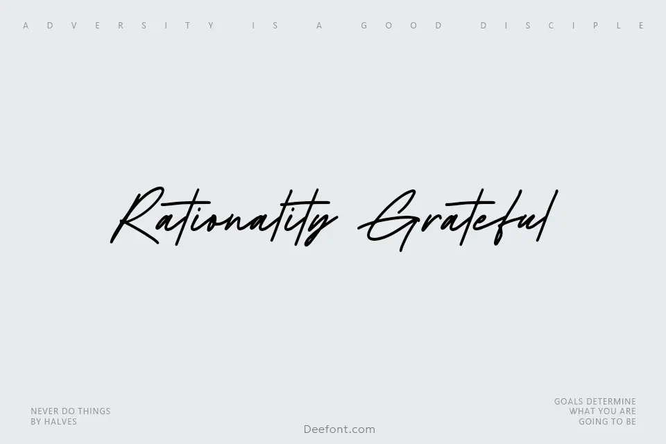 Rationality Grateful is an elegant handwritten font that exudes sophistication and charm through delicate, flowing strokes and carefully crafted letterforms. This script typeface bridges the gap between casual handwriting and refined calligraphy, featuring graceful curves and swooping lines ideal for wedding invitations, greeting cards, branding materials, and social media graphics. The font’s femininity and elegance make it perfect for projects seeking a personal, emotional connection with the audience.
