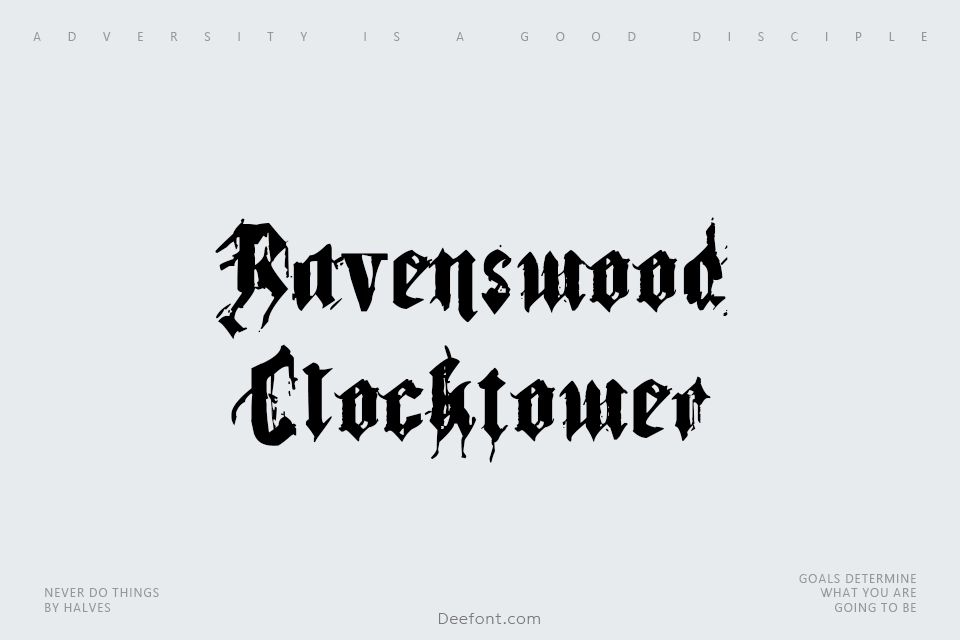 Ravenswood Clocktower is a bold and modern gothic font designed by Chequered Ink, featuring a distinctive eroded texture that adds an edgy and mysterious touch to creative projects. Perfect for album covers, movie posters, and video game titles, this semi-condensed typeface commands attention with its striking presence and dark, captivating atmosphere. The font captures the essence of contemporary gothic artistry while maintaining a sophisticated visual impact for both commercial and personal design work.