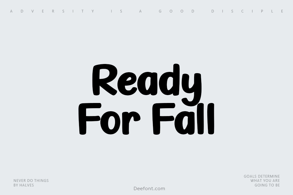 Ready For Fall is a bold handwritten font that brings the cozy charm of autumn to your designs. With its thick strokes and natural, hand-drawn style, this font adds warmth and personality to any project. Perfect for seasonal invitations, greeting cards, and social media posts, Ready For Fall captures the essence of fall with its playful, organic aesthetic. Ideal for designers seeking a versatile font that combines elegance with a friendly, approachable feel for all your autumn-inspired creative projects.