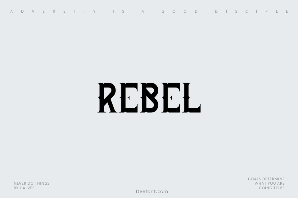 Rebel is a striking Gothic display typeface designed with bold, rugged edges and distinctive character that combines modern aesthetics with vintage influence. This versatile font features strong and eye-catching letterforms perfect for branding projects, posters, logos, product packaging, and magazine headers. With its edgy geometric design and raw, unpolished aesthetic, Rebel delivers powerful visual impact for designers seeking a rebellious and contemporary look that commands attention while maintaining excellent readability across various applications and sizes.