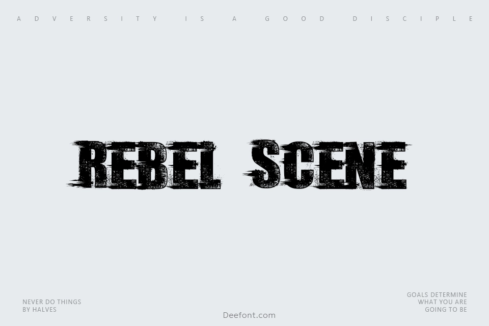 Rebel Scene is a bold, distressed display font featuring special textured effects perfect for creative projects. With a lifestyle street theme aesthetic, it combines uppercase and lowercase letters in a heavy, impactful style ideal for posters, covers, branding, and digital designs. This dynamic typeface brings edgy character and visual impact to any project requiring distinctive typography.