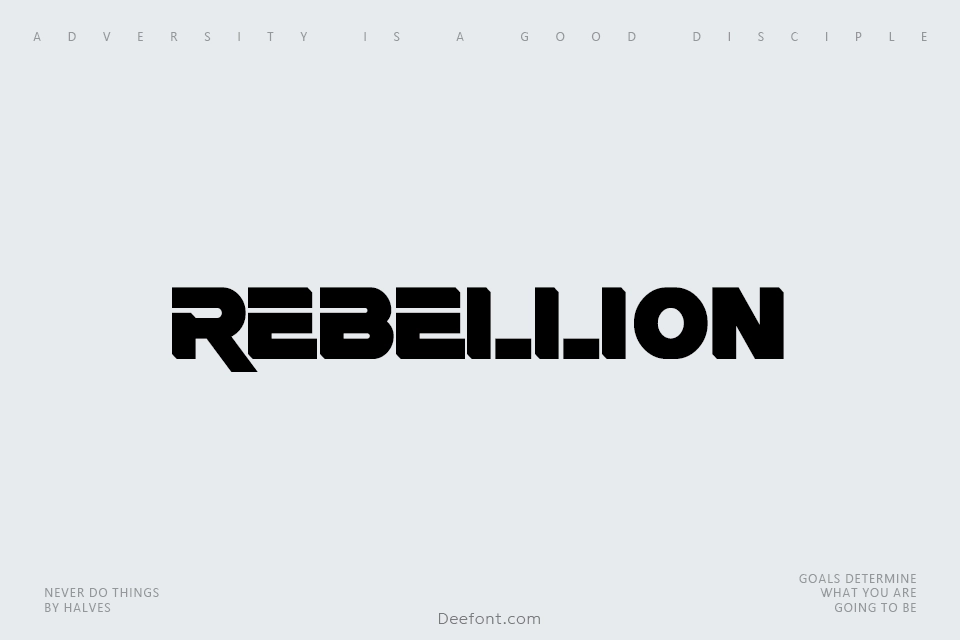 Rebellion is a bold, display typeface inspired by the logo of Disney/Lucasfilm’s Star Wars Rebels animated series. Featuring thick strokes, minor flourishes, and sharp corner nicks, Rebellion epitomizes a sci-fi and futuristic aesthetic ideal for posters, branding, titles, and any creative project needing a strong, distinctive look. It supports full alphanumerics, extended punctuation, and euro symbols, and is available in both regular and italic weights. Perfect for anyone seeking a modern, attention-grabbing font in tech or fantasy genres.