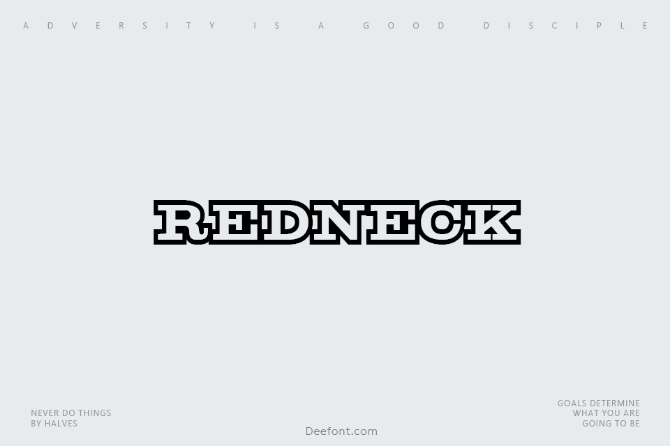 Redneck is a distinctive display typeface designed by Vladimir Nikolic, featuring an outlined serif style with bold and heavy weight variants. This retro-inspired font combines rustic charm with modern appeal, making it ideal for eye-catching headlines, creative logos, and decorative typography projects. With its unique character and versatile styling, Redneck brings personality and impact to any design composition.