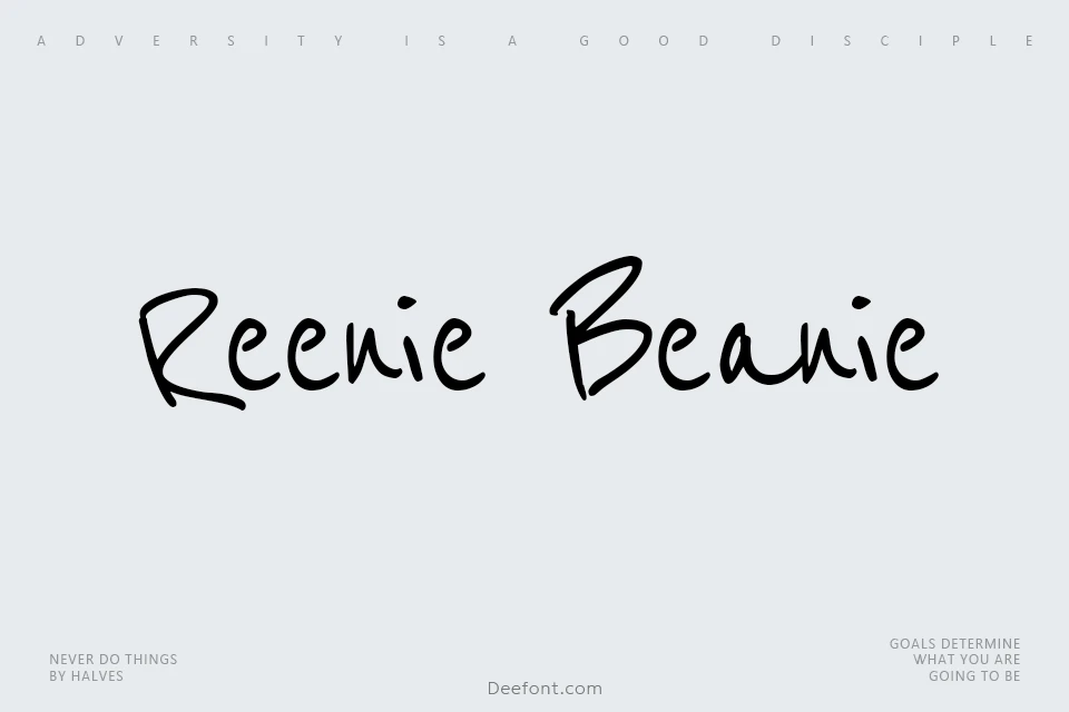 Reenie Beanie Font is a casual, handwritten font that mimics the natural flow of penmanship, featuring slightly irregular characters for an authentic, personal touch. Its smooth, fluid strokes and informal charm make it ideal for personal notes, invitations, greeting cards, and creative projects that require an approachable, friendly feel.