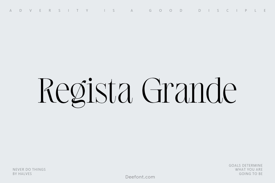 Regista Grande is a modern and elegant serif typeface designed by Kulokale Studio, available in Regular and Italic versions. This refined display font features bold dynamics with fashionable elements, making it ideal for sophisticated branding, editorial design, and contemporary applications. Perfect for titles, headlines, logotypes, advertising materials, packaging designs, and magazine layouts, it combines distinctive artistic character with a stylish, expressive aesthetic suitable for professional typography projects.
