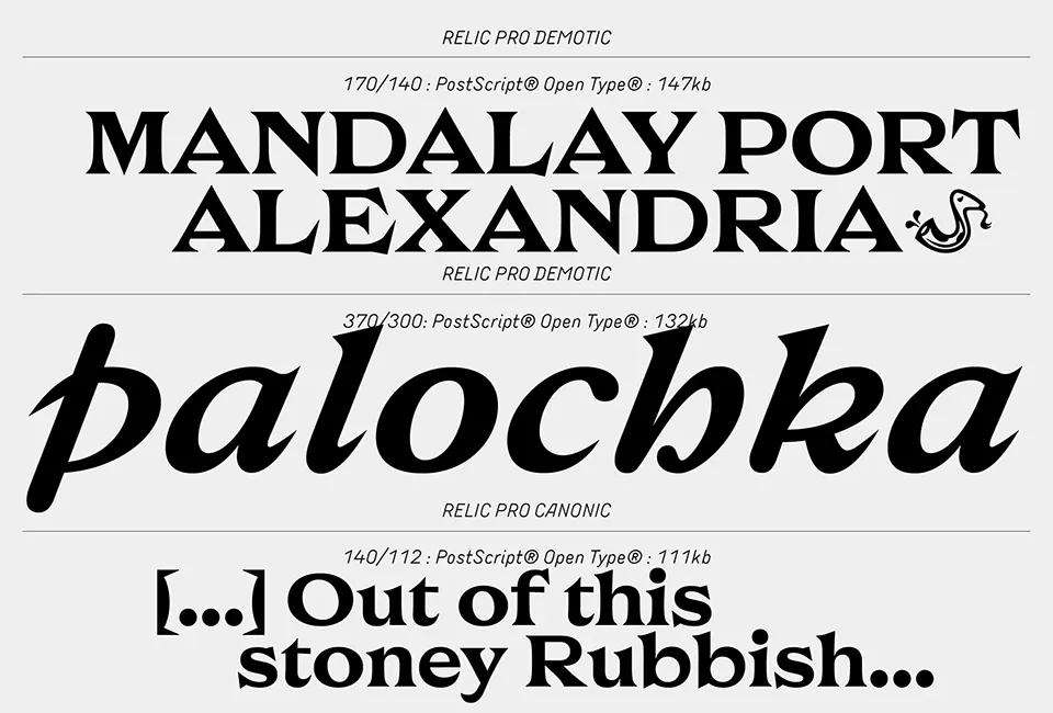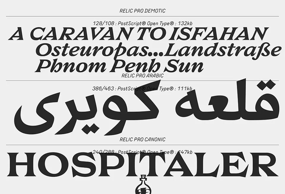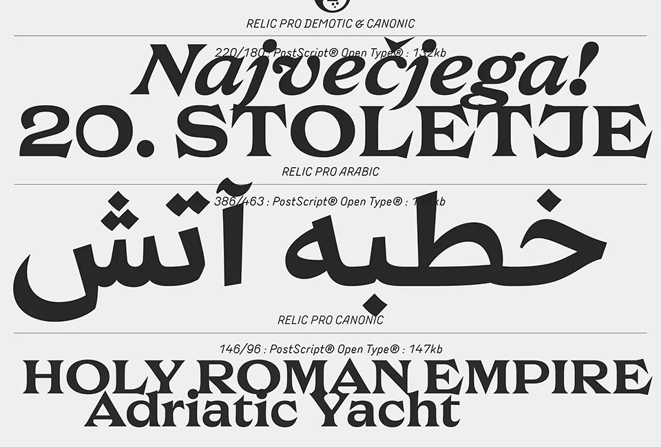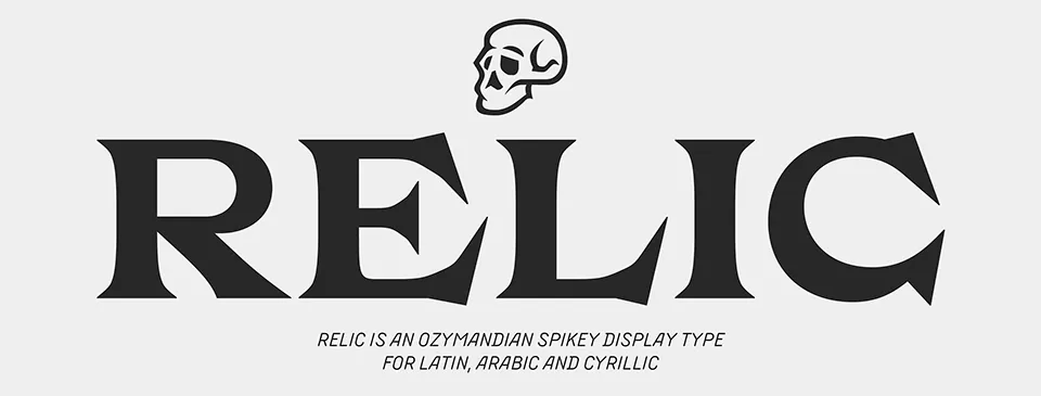 Relic Font font is a paleo-modernist, spikey display typeface inspired by desiccated monuments, vast landscapes, and the weathered beauty of ancient ruins. With support for Latin, Cyrillic, and Arabic scripts, Relic is designed to make a bold statement in titling and display settings, blending a sense of history with a modern edge.