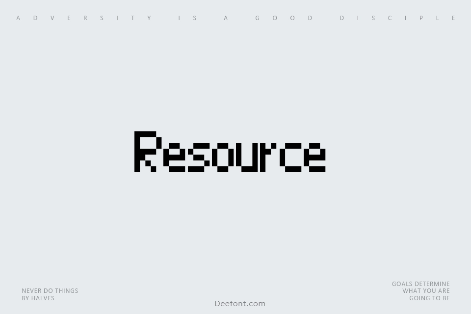 Resource is a versatile bitmap font crafted by designer Danny Phantom, optimally displayed at 16 pixels. This compact typeface delivers crisp, retro-styled characters perfect for vintage gaming interfaces, pixel art projects, and digital designs. With 178 glyphs supporting accents and Euro symbols, Resource combines minimalist aesthetics with functional typography. Its clean geometric forms make it ideal for creating nostalgic user interfaces and creative digital compositions that evoke classic computing aesthetics.