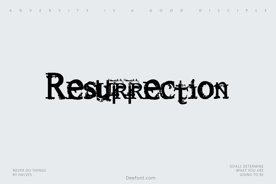 Resurrection is a bold and striking Gothic display font designed to make a powerful impact in modern design projects. With its contemporary yet edgy aesthetic, this typeface combines traditional Gothic elements with modern sensibilities, perfect for creating eye-catching headlines, poster designs, and dramatic typographic compositions. Its destroy-style characteristics give it a distressed, powerful appearance that stands out across various creative applications. Ideal for designers seeking an unconventional, attention-grabbing typeface for branding, music-related projects, and experimental typography work.