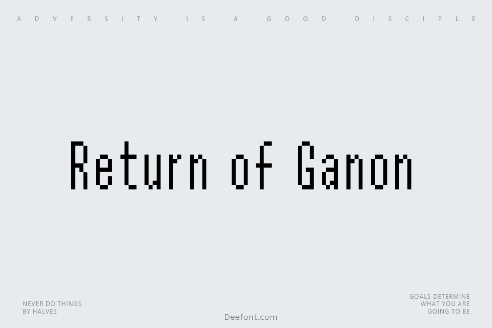 Return of Ganon is a retro-inspired bitmap font inspired by The Legend of Zelda video game series, created by Cody Boisclair. This chunky and geometric display font features sharp edges and bold letterforms that deliver a powerful, nostalgic aesthetic perfect for video game-related designs, iconic headers, posters, and eye-catching graphic projects. With its distinctive pixelated charm and striking visual impact, it brings a classic arcade gaming atmosphere to any creative work seeking bold, memorable typography.