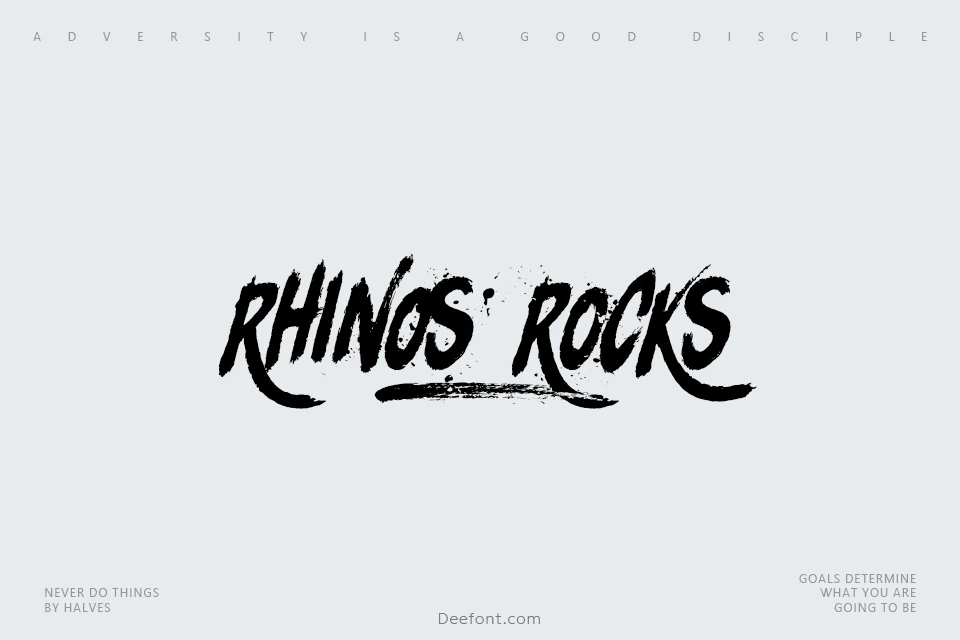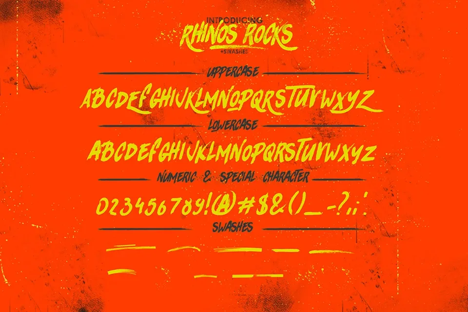 Rhinos Rocks Brush Font is a bold and energetic brush typeface featuring quick strokes and sharp edges, designed to make loud statements. With both regular and slant versions, this font mimics a paint-brushed signature and is ideal for posters, branding, invitation cards, logos, and any project that requires a hand-drawn, aggressive style. Its natural, marker-made look brings a unique and powerful presence to your creative work.