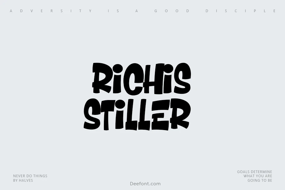 Richis Stiller Font is a playful and cheerful display font with a bold, cartoon-inspired style. Its bouncy, slightly irregular shapes make it perfect for fun and friendly designs, such as posters, comics, branding, and children’s projects. The font’s lively character adds a touch of whimsy and energy to any creative work.