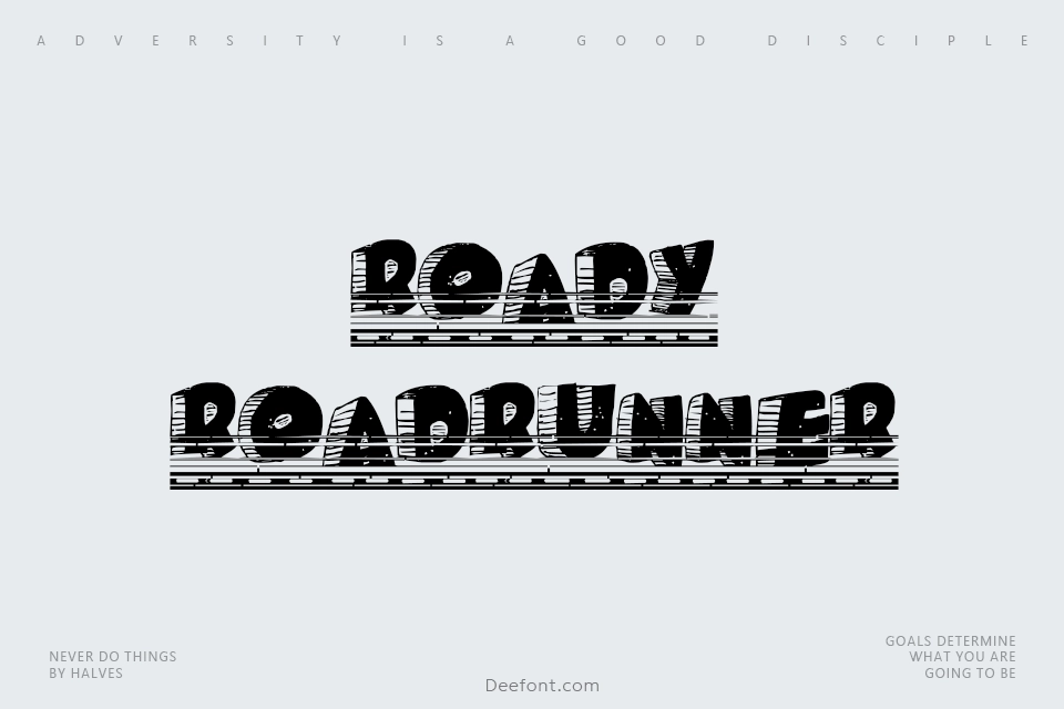 The Roady Roadrunner font is a playful and dynamic decorative typeface featuring bold, rounded letterforms filled with horizontal lines that mimic musical staffs. Designed by Susanne Fiedler, this cartoon-style font incorporates musical notes and rhythmic elements throughout its characters, making it ideal for music-related projects, creative branding, event posters, and children’s publications. With 67 carefully crafted characters including uppercase, lowercase, numbers, and special symbols, the font delivers consistent visual energy and artistic flair suitable for headlines, logos, and designs that require a sense of movement and fun.