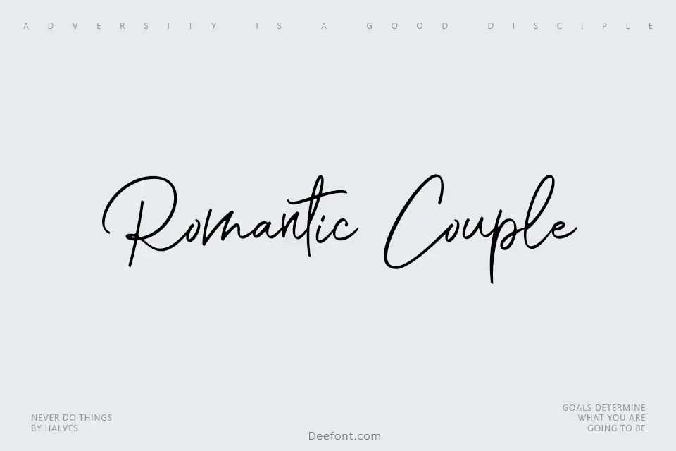 Romantic Couple Script is an exquisite flowing script typeface that brings emotional elegance to your designs. This handwritten-style font features smooth, connected cursive strokes with a natural romantic aesthetic, offering 225 carefully crafted characters including uppercase, lowercase, numerals, and punctuation. The font excels in creating stunning wedding invitations, save-the-date cards, feminine branding projects, calligraphy-inspired posters, greeting cards, and decorative headlines. Its graceful letterforms and authentic handwriting appearance make it ideal for designs requiring a personal, intimate touch that conveys sophistication and warmth. Whether used for luxury packaging, social media headers, or romantic announcements, Romantic Couple Script delivers timeless elegance with a modern sensibility.