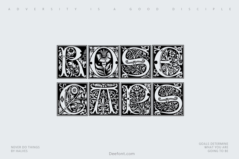 Rose Caps is a decorative Gothic initials font featuring intricately designed uppercase letters adorned with elaborate floral and vine motifs. Each letter is enclosed within a square frame with ornamental embellishments, creating a highly artistic and elegant appearance reminiscent of vintage classical designs. Ideal for wedding invitations, decorative book covers, headlines, and projects requiring a touch of sophistication and classical elegance.