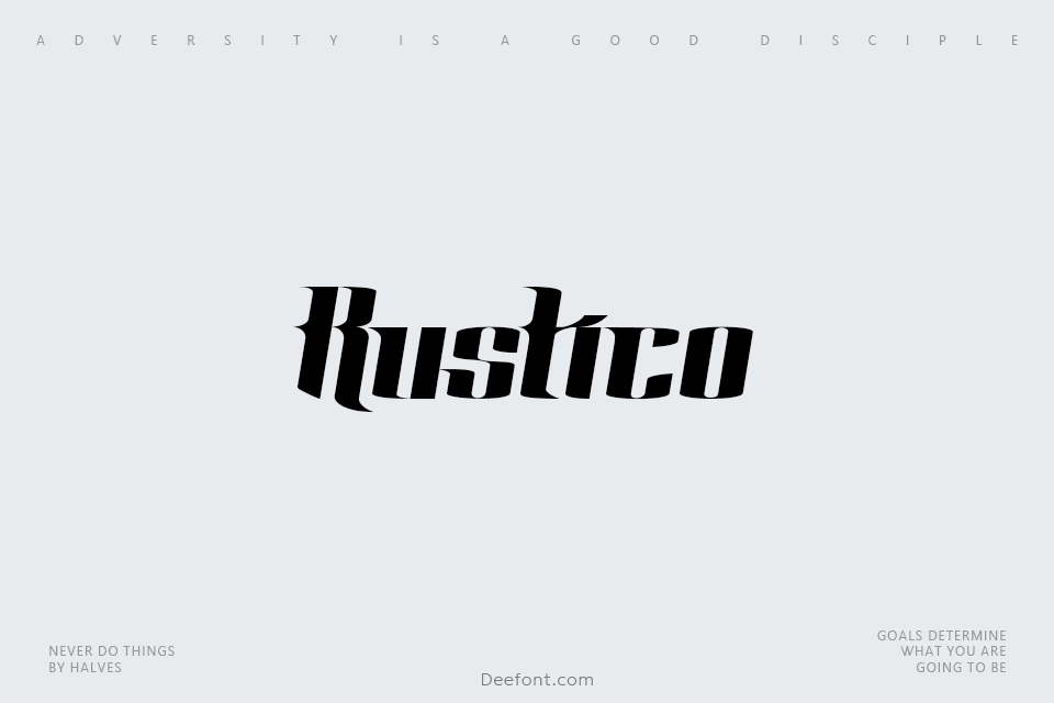 Rustico is a distinctive fancy display typeface designed with decorative flair and artistic character. Featuring varied letterforms and ornamental styling, this font brings a charming, elegant aesthetic to any creative project. Perfect for headlines, branding, and artistic compositions that demand visual impact and distinctive personality. Its unique design elements make it ideal for projects seeking unconventional typography with personality and charm.