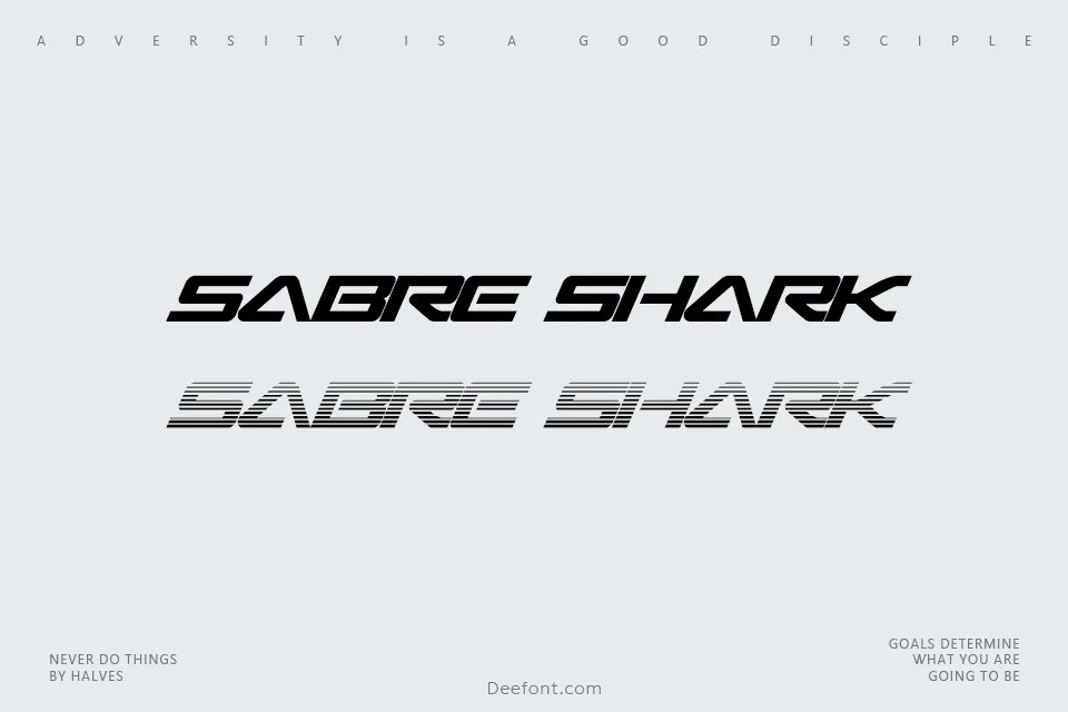Sabre Shark is a bold and dynamic futuristic font featuring sharp, angular edges and geometric letterforms with a powerful sci-fi aesthetic. This versatile typeface is available in 29 distinctive variations, including regular, semi-bold, bold styles combined with semi-straight, italic, condensed, and expanded widths. Perfect for technology-focused designs, gaming interfaces, posters, and modern digital projects, Sabre Shark delivers a commanding presence with its contemporary, innovative appearance that combines angular precision with futuristic flair. The font’s dynamic slant and geometric construction make it an excellent choice for headlines, branding, and creative typography that demands visual impact.