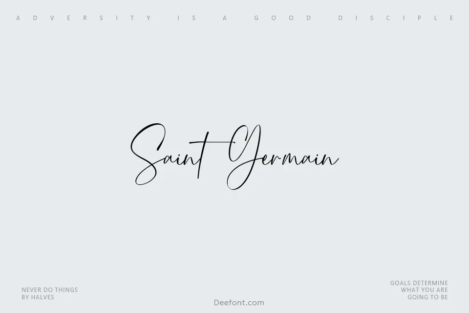 Saint Germain is a sophisticated handwritten script font featuring delicate, refined strokes and extra-light weight that exudes elegance and grace. With its flowing curves and airy feel, this typeface is ideal for wedding invitations, branding materials, logos, feminine designs, and upscale stationery. The font’s natural handwriting style and versatile character set make it perfect for creating elegant quotes, magazine headers, social media posts, product packaging, and any project requiring a subtle yet graceful typographic touch.