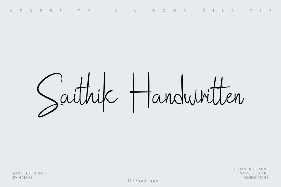 Saithik Handwritten is a versatile handwritten script font featuring organic, flowing letterforms with natural variations in stroke width that create an authentic, personal touch. Designed for maximum expressivity, this font excels in poster designs, invitation cards, branding projects, and creative display applications. Its elongated and playful character set includes 300 beautifully crafted glyphs, making it ideal for eye-catching titles, greeting cards, packaging designs, and social media graphics. The casual elegance of the typeface brings warmth and individuality to both print and digital projects.