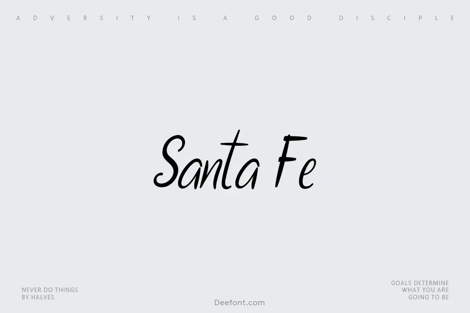 Santa Fe is an elegant handwritten script font featuring flowing, organic letterforms with rounded corners and dynamic stroke variations. Designed for display purposes, it excels in creative applications such as poster designs, logo creation, product packaging, greeting cards, and artistic projects. The font’s warm, personable aesthetic brings character to wedding invitations, event promotions, and decorative layouts. With its authentic handwritten quality and approachable elegance, Santa Fe is perfect for brands seeking a humanized, artistic touch while maintaining professional readability.