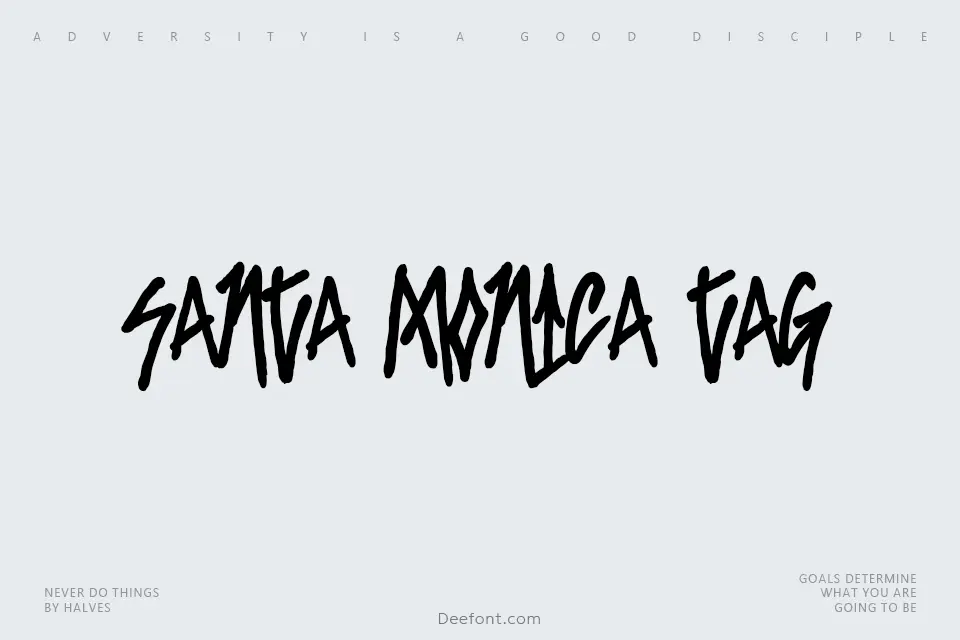 Santa Monica Tag is a vibrant graffiti and script typeface created to capture the urban aesthetic of tag-style lettering. This dynamic font combines the energetic flow of street art with readable typography, making it perfect for eye-catching headlines, posters, album covers, and creative design projects. With its bold character and expressive strokes, Santa Monica Tag brings authentic urban flair to any creative endeavor, ideal for designers seeking to add contemporary edge to their visual communications.