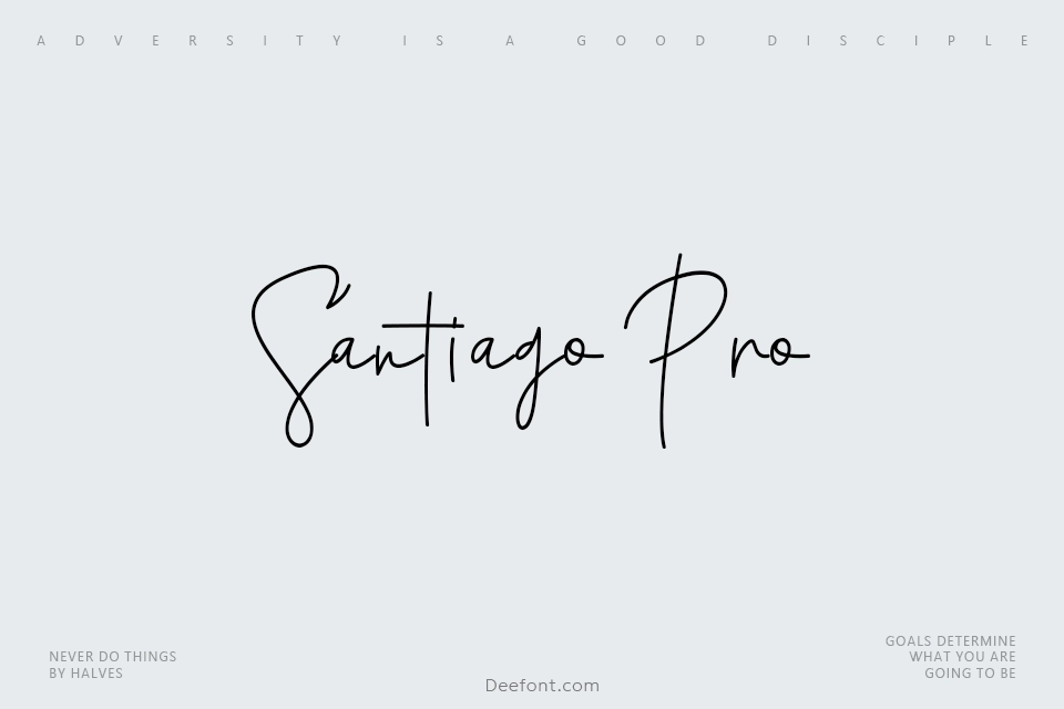 Santiago Pro is an elegantly monoline handwritten script font designed by Ahmad Khaidir. This signature-style typeface features natural handwriting aesthetics with 23 ligatures and stylistic sets, making it perfect for branding, logos, wedding designs, social media posts, packaging, advertisements, invitations, stationery, and various creative projects. The font contains 56 glyphs and delivers a charming, contemporary feel suitable for both digital and print applications.