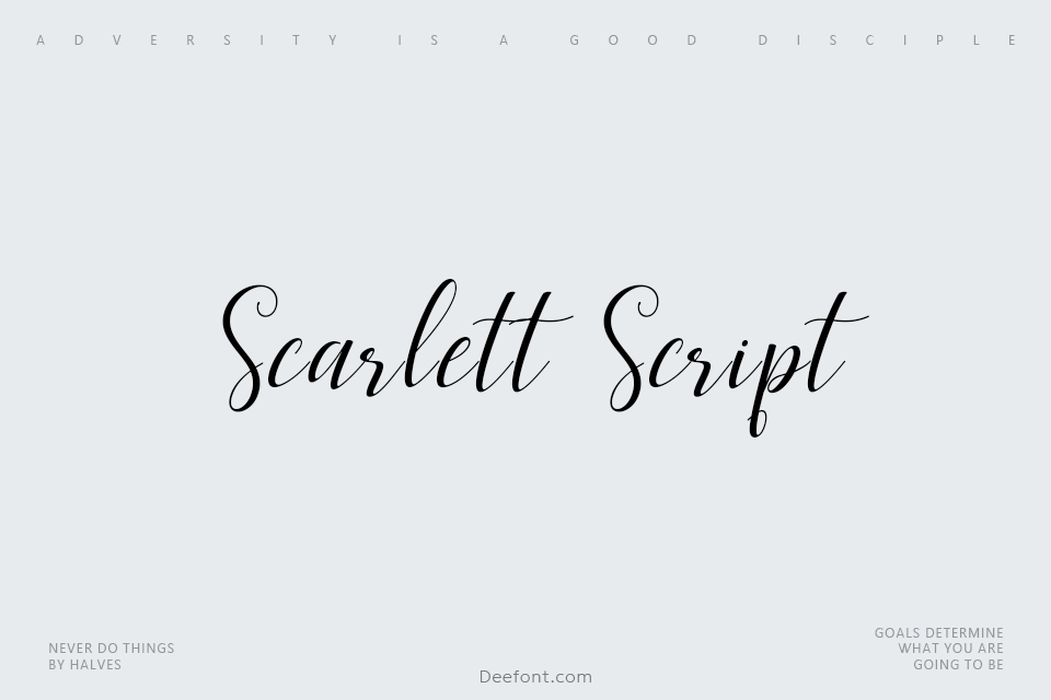 Scarlett Script is a modern and romantic calligraphy font designed for elegant and charming typography. This versatile script typeface features fluid strokes and sophisticated letterforms, making it ideal for invitations, logos, branding, and creative design projects. With its friendly feel and adaptable character, this font seamlessly fits a wide range of contexts, from formal occasions to contemporary creative applications. Supported for personal, non-profit, and charity projects.