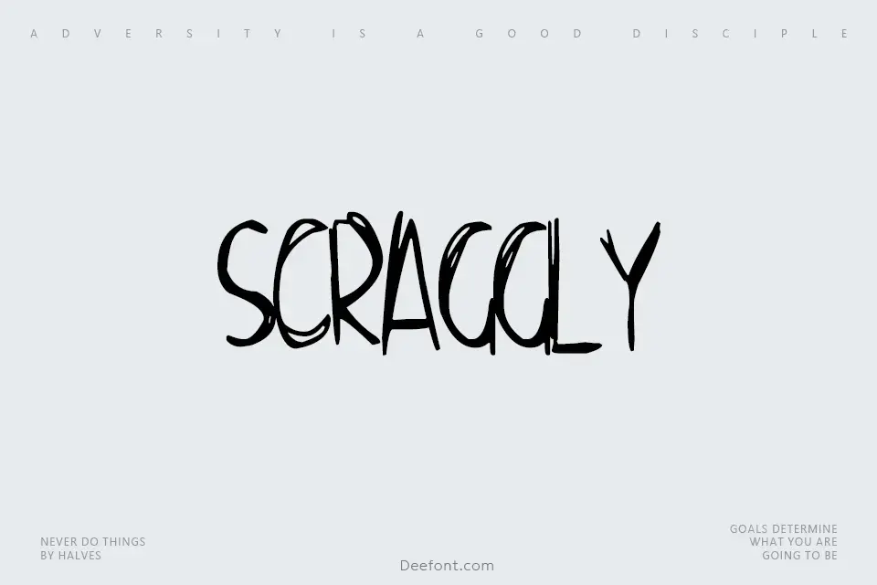 The Scraggly font is a chaotic, hand-drawn typeface designed to evoke unease and raw energy. With its jagged edges and uneven strokes, this messy script is ideal for horror movie titles, Halloween party invitations, and grunge-inspired music covers. Its distressed texture adds an authentic, scary vibe to any creative project needing a touch of darkness.