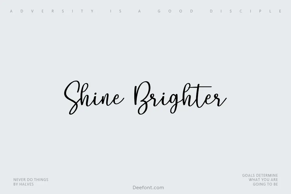 Shine Brighter is an elegant handwritten script font featuring smooth, flowing letterforms with refined curves and decorative flourishes. This sophisticated display typeface includes 164 ligatures that connect letters seamlessly for naturally flowing text. Ideal for posters, wedding invitations, logo design, blog quotes, packaging, and marketing materials, the font adds warmth, personality, and artistic flair to any creative project. Its versatile handwritten style works beautifully for formal occasions, brand identity development, and decorative applications requiring an elegant, contemporary aesthetic.