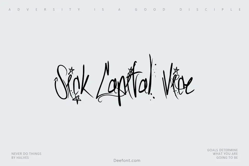 Sick Capital Vice is a bold, expressive graffiti-style script font created in 2010 that captures the raw energy of urban street art. This distinctive typeface features dynamic hand-drawn letterforms with star accents, dash marks, and irregular strokes that give it an edgy, rebellious character. Perfect for projects requiring an authentic street art aesthetic, Sick Capital Vice works exceptionally well for logos, posters, album covers, apparel designs, and any creative work that demands attention. The font includes both TTF and OTF formats with 201 glyphs, offering comprehensive character coverage. Its unique blend of graffiti artistry and readable lettering makes it a versatile choice for designers seeking to add urban flair to their projects.