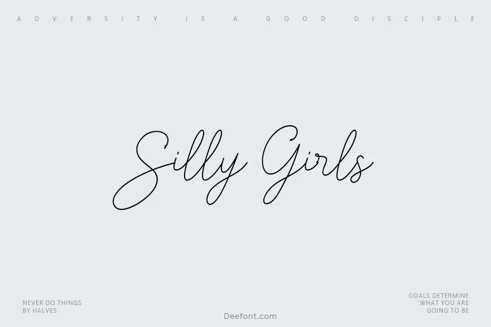 Silly Girls is an elegant and flowing handwritten script font featuring smooth, connected strokes that mimic natural cursive writing. With its graceful curves and dynamic baseline, this display font excels in creating eye-catching titles, headers, and headlines for posters, greeting cards, invitations, and creative packaging. The font’s playful yet refined character makes it ideal for fashion-forward designs, social media graphics, children’s books, and branding projects that demand a touch of feminine sophistication. Its 91 glyphs and extensive OpenType features including ligatures provide versatility for both formal and casual applications.