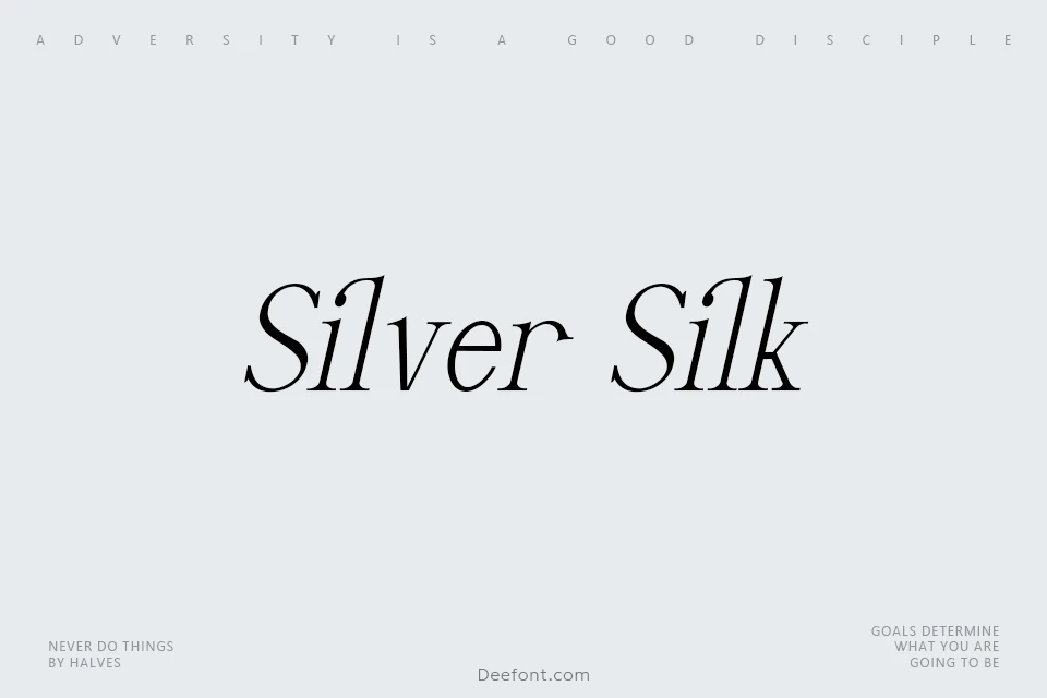 The Silver Silk Font font is a sophisticated and elegant serif typeface designed to bring a touch of refinement to your creative projects. Its graceful curves and stylish details make it ideal for branding, editorial design, invitations, and more, providing a timeless and versatile look for both digital and print applications.