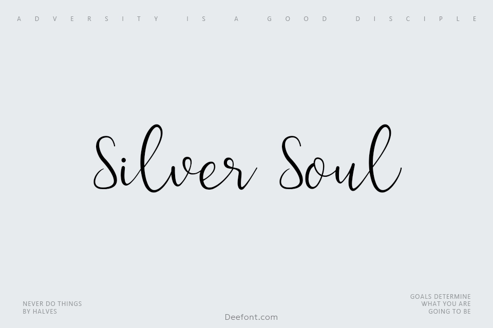 Silver Soul is an elegant modern calligraphy script font designed by Mohamad Fahrul Anggoro. This sophisticated typeface combines artistic handwritten elements with contemporary design, making it perfect for logos, wedding invitations, branding, signatures, and creative projects. With 257 glyphs supporting multiple languages, the font delivers a refined aesthetic ideal for elegant typography and luxurious design applications.