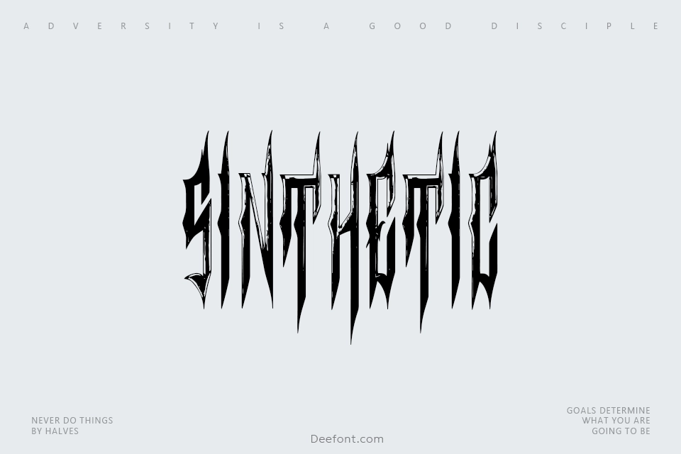 Sinthetic is a bold, eroded blackletter display font designed by Chris Vile through Font Monger. Released in March 2016, this distinctive typeface features sharp, gothic characteristics with a rugged, weathered aesthetic. Perfect for horror-themed designs, music posters, and edgy branding projects, Sinthetic combines aggressive letterforms with decorative flair. With over 28,000 downloads on DaFont, the font demonstrates strong appeal for designers seeking dramatic and unconventional typography. The design balances modern boldness with classic gothic elements, making it ideal for projects requiring visual impact and distinctive character.