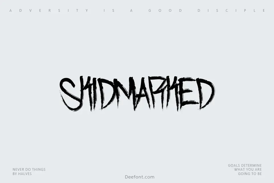 Skidmarked is a bold distressed display font with heavily fragmented, grungy letterforms that evoke decay and urban rawness. Its jagged edges and eroded character design make it ideal for creating striking horror-themed posters, Halloween invitations, music album covers, and edgy merchandise designs. The font’s aggressive visual texture adds immediate impact to headlines and titles seeking a rebellious, dangerous aesthetic suitable for graffiti-inspired graphics, film title sequences, and punk-rock branding applications.