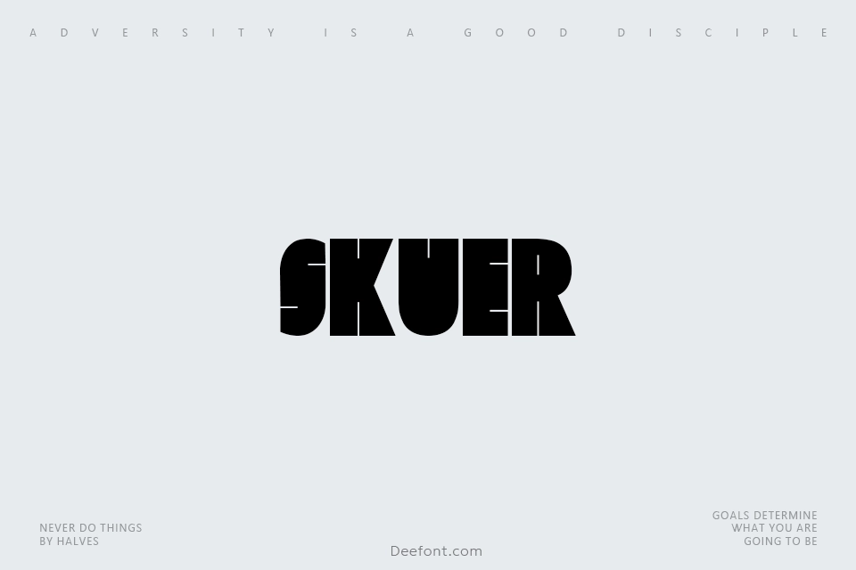 Skuer is a free, bold geometric sans serif typeface created in 2012 by Valdet Hajdari, featuring an urban style design. The font offers unified uppercase and lowercase characters, making it perfect for headlines, logos, posters, and branding projects. Its distinctive geometric construction and clean lines make it ideal for contemporary design applications.