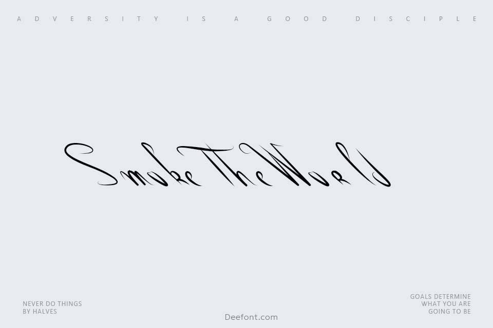 Smoke The World is an elegant, slanted script font designed by Qkila that features thin, curly characters perfect for wedding invitations, greeting cards, and creative typography projects. This distinctive typeface combines graceful flowing strokes with a dreamy aesthetic, making it ideal for designers seeking sophisticated lettering with contemporary flair. Its lean style and artistic curves offer a unique approach to display typography while maintaining readability for titles and special occasions.