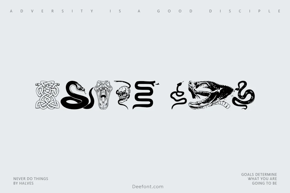 Snake Mix is a bold, decorative dingbat font featuring intricate snake-themed designs with high contrast and detailed vector artwork. Perfect for wildlife posters, nature-themed branding, mythological illustrations, and decorative art projects. This unique typeface combines artistic creativity with versatility, ideal for logos, thematic designs, and eye-catching visual compositions.