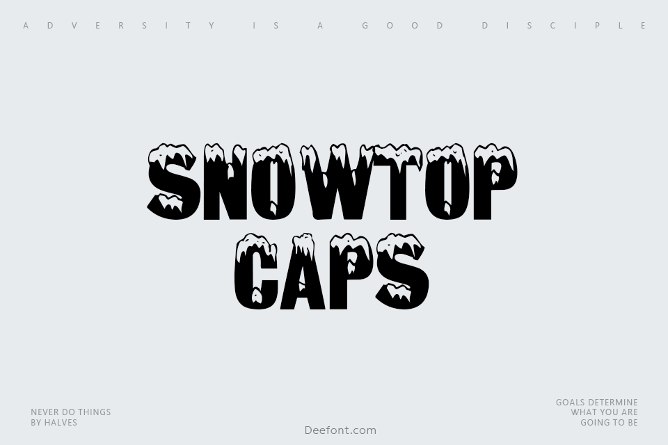 Snowtop Caps is a bold and whimsical decorative display typeface designed by Dieter Steffmann, featuring distinctive snowy peaks adorning each character. This fancy font perfectly captures the playful essence of winter, making it ideal for holiday designs, festive celebrations, and seasonal projects. With its charming frosty embellishments and robust letterforms, this versatile font delivers visual impact while maintaining legibility, suitable for greeting cards, event posters, branding materials, and any creative project seeking to evoke warmth and merriment during colder seasons.