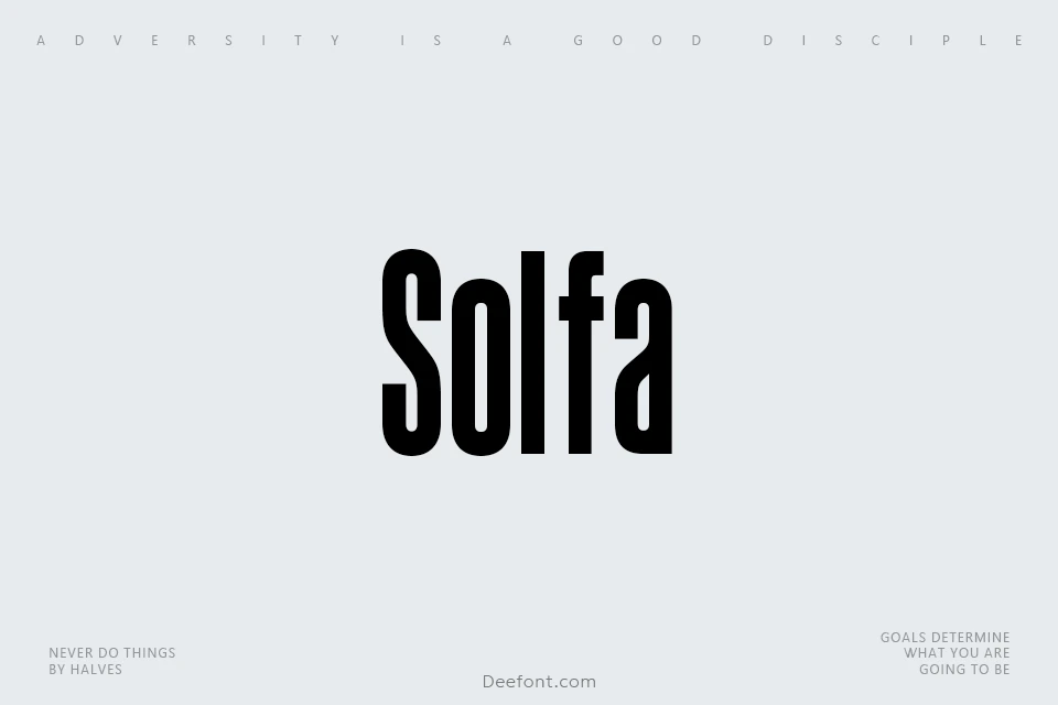 Solfa Font is a condensed sans serif typeface known for its flat-sided, blocky appearance and spurless letters. Designed to deliver a strong visual impact, it is ideal for bold headlines, social media graphics, and advertising. The font channels a robust, sturdy aesthetic with minimal optical corrections, bringing a touch of brutalist style and a hint of historical flavor to any project. Originally crafted for branding purposes, Solfa Font stands out with its raw and straightforward character.