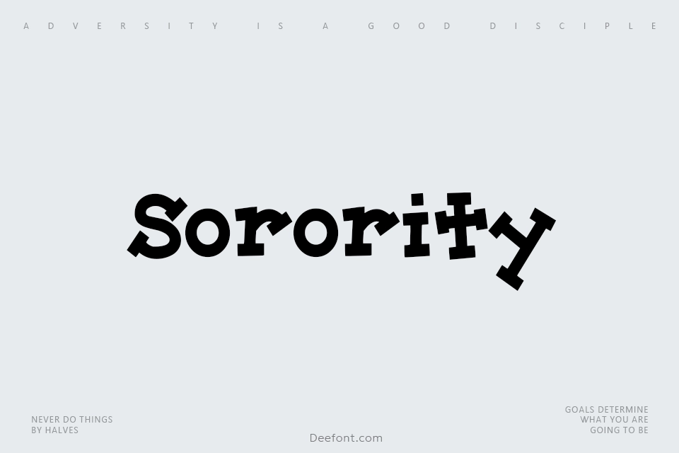 Sorority is a bold, playful display font with quirky, irregular characters and a whimsical appearance. Designed by Kreative Korporation, this decorative typeface features thick, slightly tilted letters that give each character charm and personality. With 672 glyphs including uppercase, lowercase, numbers, and special characters, Sorority is perfect for projects requiring a touch of humor and creativity. Ideal for children’s books, party invitations, playful branding, creative posters, and headlines, this eye-catching font brings a fun, youthful energy to any design project requiring personality and distinctive visual appeal.