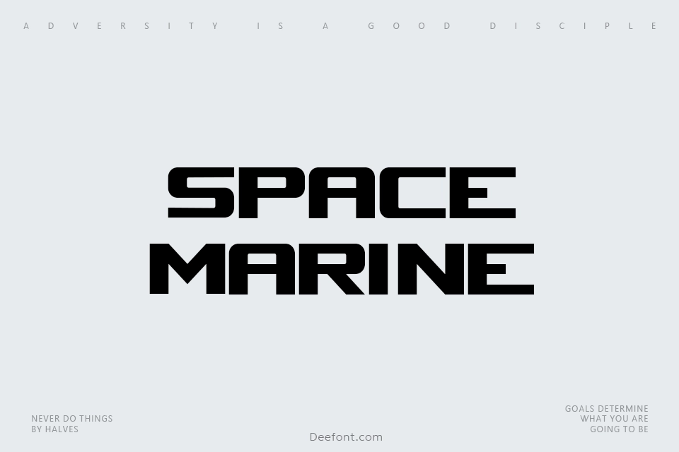 Space Marine is a bold, uppercase techno and sci-fi font designed with sharp, angular letterforms perfect for futuristic projects. This eye-catching typeface features cutting-edge styling without lowercase letters, making it ideal for impactful headlines, labels, posters, web designs, and packaging. The font’s sleek geometric construction delivers a modern, tech-forward aesthetic that brings contemporary flair to any creative endeavor.