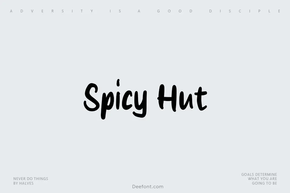 Spicy Hut is an expressive semi-bold handwritten font designed for creative professionals seeking playful yet sophisticated typography. With its distinctive flowing curves and energetic letterforms, this display script excels in eye-catching applications from restaurant menus and social media graphics to product packaging and custom logos. The font’s balanced character combines casual charm with refined elegance, making it ideal for invitations, greeting cards, branding projects, and any design requiring a touch of personality and warmth.