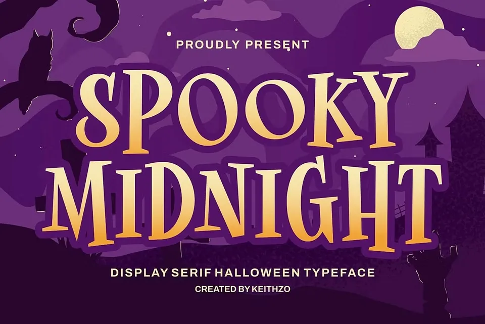 Spooky Midnight Font is a bewitching display serif Halloween font that conjures an enviable blend of elegance and eeriness. This magical typeface is sublime for Halloween-themed lettering that will add a touch of spectral sophistication to your projects. The font is ideal for outfitting frames for your home with a beautiful macabre edge or sprucing up book covers with an air of mystery. Greeting cards will adore its spectral charm, while its unique allure can turn any logo into an ominous masterpiece. With Spooky Midnight Font you can even transform a humdrum t-shirt or magazine into a thrilling Halloween-themed standout. Perfect for any project that desires a Halloween twist with an elegant touch. The font features 230 characters including uppercase, lowercase, numerals, punctuation marks, and multilingual support. This versatile display font is suitable for headlines, signage, and creative branding projects. Spooky Midnight Font truly embraces the Halloween spirit without losing its versatility, making it perfect for both personal and commercial Halloween-themed designs.