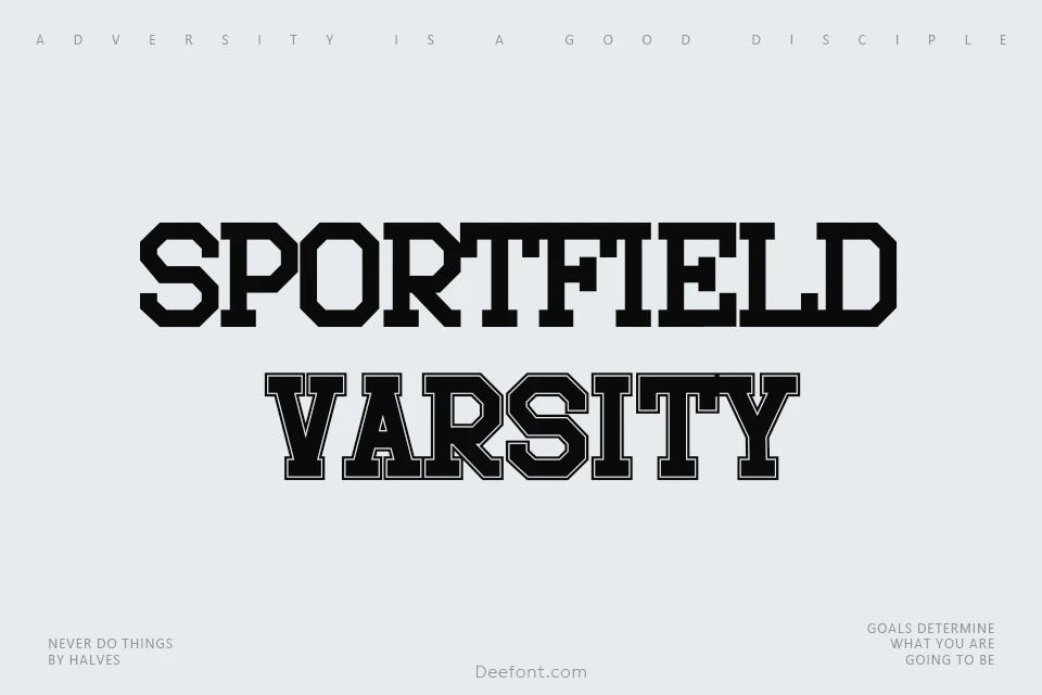 Sportfield Varsity Font is a dynamic and energetic typeface designed for athletic and sports-related designs. This font family features strong, angular letters that convey power and motion, making it perfect for logos, headlines, and impactful graphic elements. Created by Rvandtype Studio, it comes in nine distinct styles including Regular, Italic, Grunge, multiple Outlines, Shadow, and Scrible variations. The font supports Latin languages and showcases a bold, geometric character set reminiscent of varsity and sports lettering. While free for personal use, a commercial license is required for business applications. Its sporty aesthetic and versatile styles make it an excellent choice for creating eye-catching sports-themed designs and athletic branding.